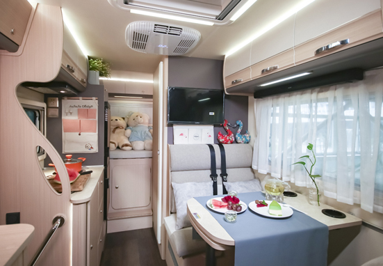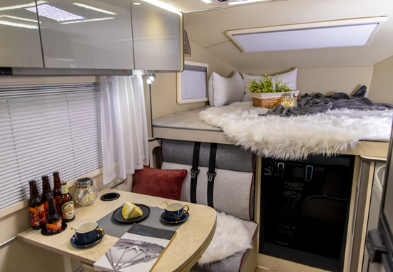 與自行式A型房車相比,自行式C型房車空間稍顯不足,但又比自行式B型房車空間寬敞、設備齊全--起居室、廚房、盥洗室、臥室具有大量櫥柜,攜帶大量行李絲毫不成問題。同時車內(nèi)具有影音娛樂系統(tǒng)、空調(diào)、可轉(zhuǎn)化桌沙發(fā)椅等,總而言之,自行式C型房車是安裝在車輪上的空間緊湊、設備齊全的房車類型。
